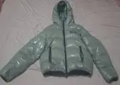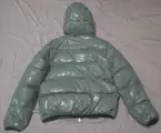 Gewatteerd ontwerp, glanzende afwerking, logopatch op de borst, klein ruitjespatroon, capuchon, ritssluiting aan de voorkant, twee zijzakken met ritssluiting, lange mouwen en rechte zoom. Materiaal: Ganzenveer.