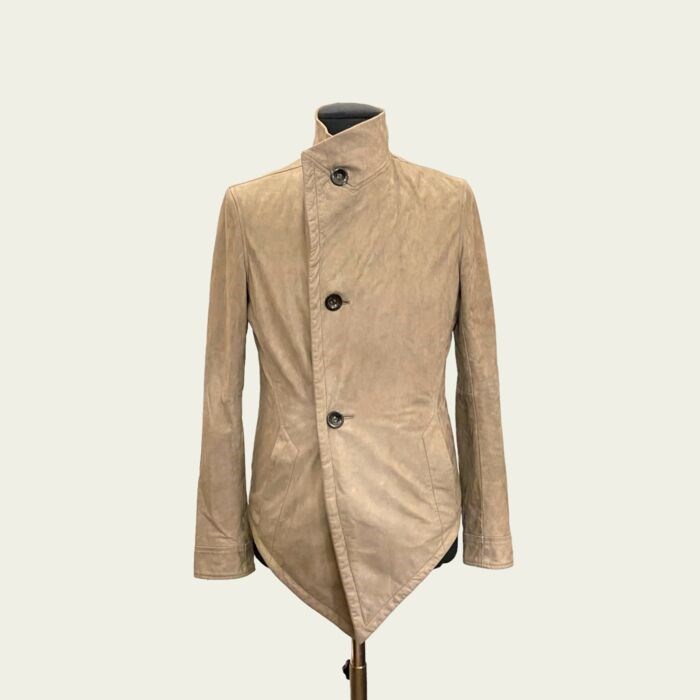Prachtig nieuw Emporio Armani leren jack, made in Italy. Jack van zacht duifgrijs suède, gevoerd met katoen, zonder splitten, met asymmetrische knoopsluiting. Aan de voorkant eindigt het broekje met twee brede punten die het figuur stroomlijnen en persoonlijkheid aan het kledingstuk geven. De manchetten zijn afgewerkt met een metalen ritssluiting met logoschuif, twee grote open zakken aan de zijkanten. De niet-uniformiteit van de kleur wordt bepaald door het natuurlijke materiaal en mag niet worden opgevat als een defect.