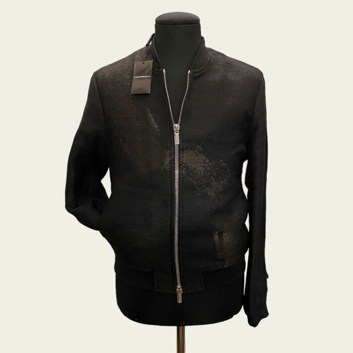 Prachtig jack van Emporio Armani, nieuw met label, gemaakt van wol en katoen in tricotsteek met een zachte touch, met metalen ritssluiting met dubbele glijder met logo, zijzakken, kraag, onderkant en manchetten afgewerkt in zachte cannolé, ongevoerd. Aan de voorkant valt een bronzen detail op dat de uniformiteit van het zwart onderbreekt als ware het een penseelstreek van kleur.