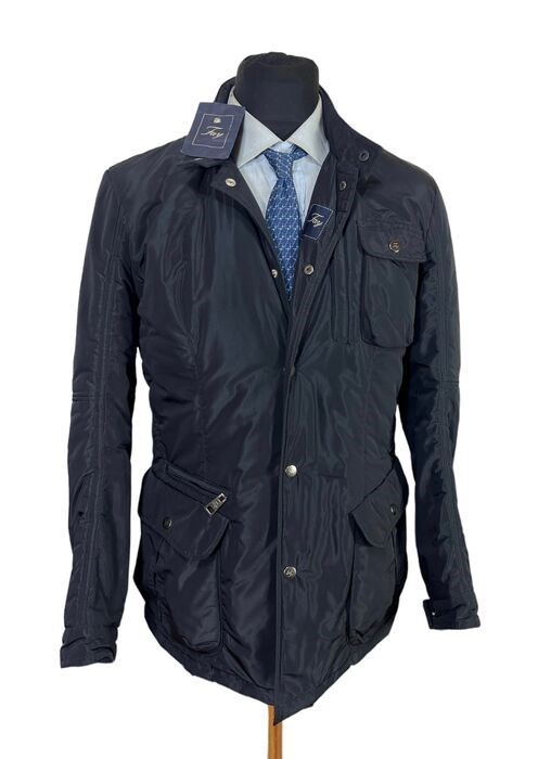 De exclusieve FAY donkerblauwe jas in blazerstijl in exclusieve technische stof met logo met een supermoderne look met exclusieve afwerkingen - huidige moderne FAY esthetische knopen en integrale donsvulling