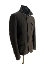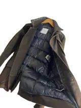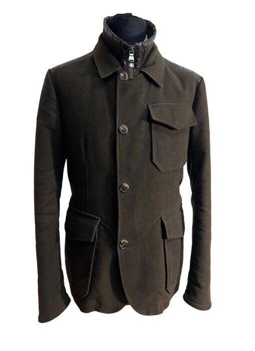 Donkerbrons in exclusieve fluweelachtige stof - moderne pasvorm met ultramodern Moncler-logo - Ultramoderne versie van knopen en ritssluiting - dubbele sluiting - zachte achterkant - mandarijnkraag -- binnenkraag bedekt met exclusieve kasjmier gebreide wol - Echt ganzendons - trekstangen van de ritsen in fijn leer - externe details op de schouders met volledige vulling in ECHTE ganzenveren