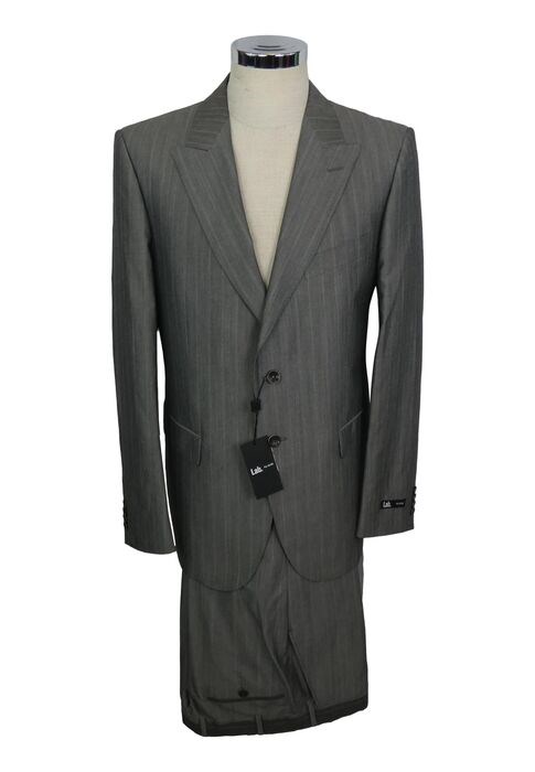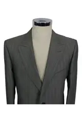 In dit kavel bieden wij u een prachtig pak, colbert met 2 knopen, opstaande borst, grijze kleur, gestreept patroon, maat 54 hoogte R, stof: 56% wol - 27% linnen - 17% zijde.