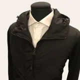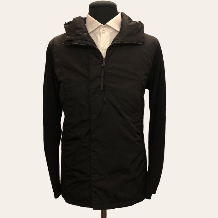 Prachtig nieuw jasje van Prada, made in Italy. Gemaakt van licht gewatteerde zwarte technische stof, heeft het een iets uit het midden verborgen opening met drukknopen en een centrale halve ritssluiting. De mouwen zijn gemaakt van wol met dichte verticale ribben, twee grote zakken met verborgen magnetische drukknopen aan de zijkanten. De opening van de capuchon is verstelbaar dankzij een intern elastisch trekkoord. Knopen, ritssluiting en logodetails. Te observeren in de details om de waarde ervan te begrijpen.