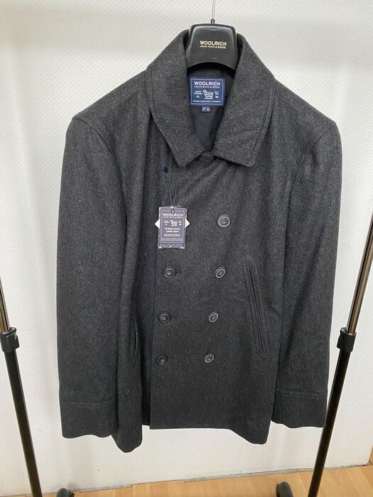 Prachtig gloednieuw met kaartjes, 100% authentieke Woolrich-modejas. Luxe Woolrich jas gemaakt van wol en kasjmier met gemengde stof, afgewerkt tot het hoogste niveau. Grijze kleur Jas gemaakt van wol, een van de kenmerkende stijlen van het merk Woolrich.