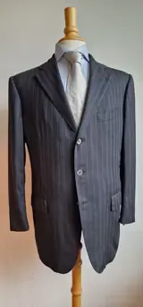Het pak heeft een krijtstreep en een 3 knoops sluiting met grijze knopen met het Zilli logo.
