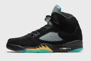 De Air Jordan V 'Aqua' heeft een bovenwerk van zwart nubuck met contrasterende 'Aqua'-accenten en 'gele' haaientanddetails in de tussenzool. Geborduurde zilveren Jumpman-tongen en doorschijnend gaas op de zijpanelen maken het ontwerp van de schoen compleet.