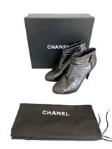 Zeer mooi paar Chanel-enkellaarzen, in zwart leer en glittertextuurleer aan de voorkant, metalen monogram op de hiel.