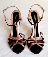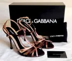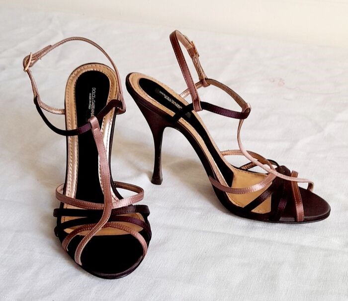 Prachtige en bijzondere Dolce and Gabbana decolleté schoenen in zeer fijn bruin, fuchsia, rosé goud zijde satijn met hak van 11 cm. Enkelband. De binnenkant van de schoen is ook in zijde satijn.