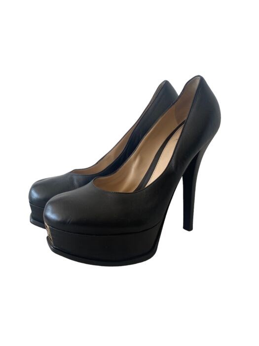 Heel mooi paar Fendi-pumps in zwart leer met monogramplaat aan de voorkant in goudkleurig metaal.