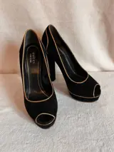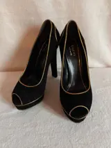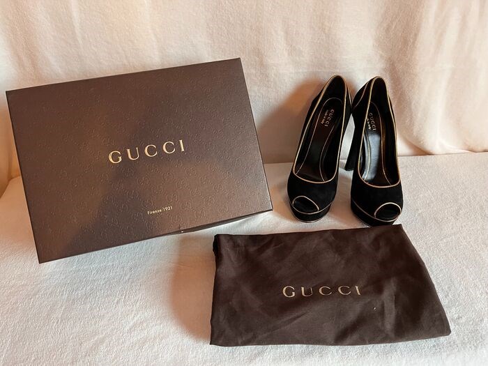 Zeer elegante Gucci peep toe pumps in zwart suède met gouddraad aan de randen, een keer gedragen en perfect bewaard gebleven zoals blijkt uit de afbeeldingen.
