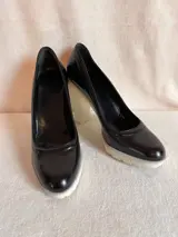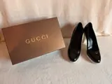 Decolleté van zwart leer met Gucci witte rubberen zool en hak, eenmaal binnenshuis gedragen en zoals blijkt uit de perfect bewaard gebleven afbeeldingen met enkele zeer lichte markeringen op het rubber zichtbaar in de afbeeldingen. Maat 37,5 EU, groot en 11 cm hoge hak, deze schoen is uiterst comfortabel en comfortabel, perfect voor dagelijks gebruik, bij voorkeur met een informele outfit. Ze worden zorgvuldig verpakt en aangetekend verzonden.