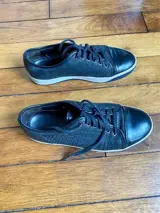DBBI Lanvin Sneaker Grijs/Antracietgroen, kalfsleer met krokodilleneffect, lakleren neus, rubberen zool.