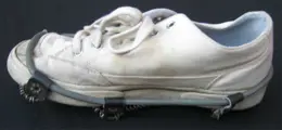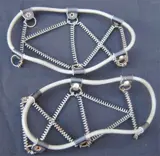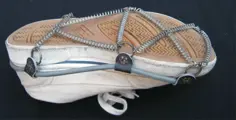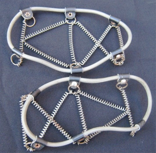 De anitislip overschoen bestaat uit stalen veren die aan een rubberen flexibele rand zijn bevestigd met leren riempjes.