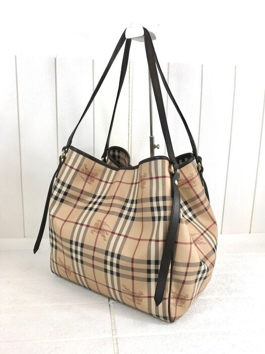 Burberry - Tote schoudertas, grote geplooide zijkanten die de capaciteit van de tas kunnen vergroten - donkerbruine leren handvatten - uitstekende staat, zelden gebruikt en zorgvuldig bewaard - afmetingen 34X52X16 cm - beige en veelkleurig met typisch Burberry-patroon - Onmiddellijke verzekerde verzending.