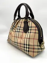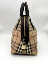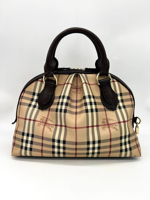 Prachtige Burberry-draagtas van gecoat canvas met burberry-patroon, bruin leer en verguld metaal. Tas met ritssluiting