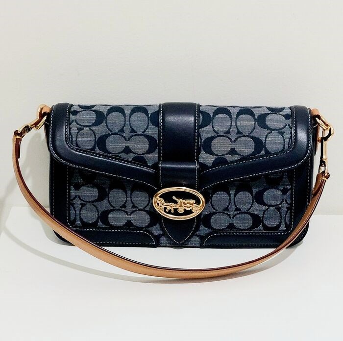 Coach-monogram Tabby. Blauw leer en denim. Bourgondische suède binnenkant. Hij kan over de schouder gedragen worden en over de schouder met de speciale schouderbanden. Zeer weinig gebruikt en in perfecte staat. Geen tekenen van slijtage. Gouden logo van het merk.