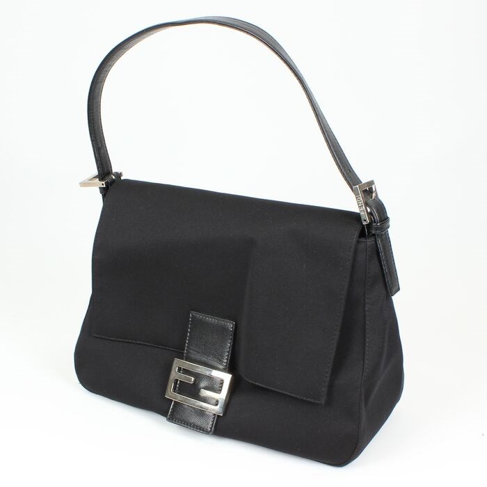Dit is een FENDI Mama baguette in het zwart. Deze chique grote schoudertas is gemaakt van fijn canvas. De tas heeft een afneembaar leren handvat en een zilveren Fendi FF-logo op de leren riemsluiting. Het opent met een magnetische drukknoop op een stoffen interieur. Deze schoudertas is ideaal voor elke gelegenheid, met de unieke chique stijl van Fendi!
