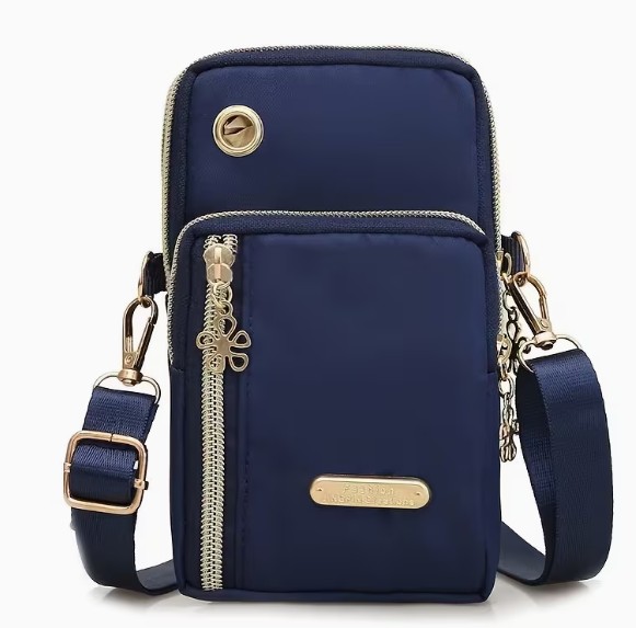 Kleine telefoon tas voor dames.Kleur: Blauw.Maat: Hoog 17cm, breed 10cm, diep 5cm.De tas heeft 4 vakken met ritssluiting.