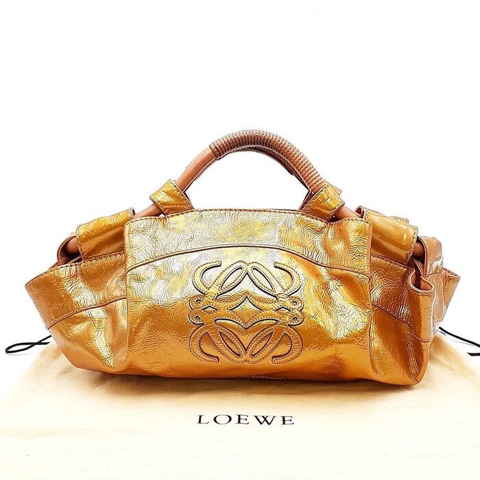 Loewe Aire medium tas in vernis leer in mosterd/goud kleur. Afmetingen ca. 45x20×17 cm.
