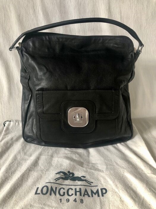 Longchamp zwarte leren hobo tas. Schouder en hand. Voorvak aan de buitenkant met de naam van het bedrijf. Onzichtbare drukknoopsluiting. Interieur met dierenprintstijl. Afmetingen: breedte 38 cm, hoogte 36 cm en diepte 9 cm. Het is in uitstekende staat, zeer lichte gebruikssporen. Het metalen deel heeft wat krassen. Met zijn stofzak.