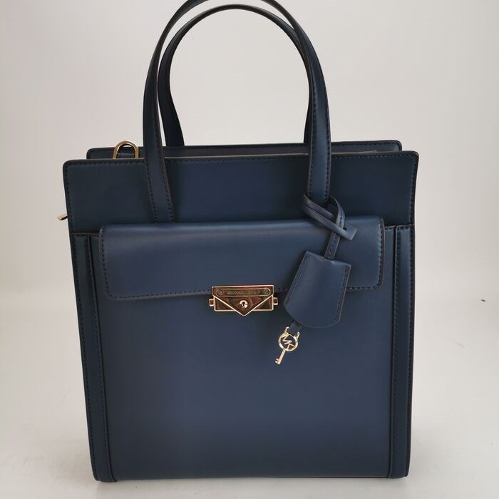 in de kleur "navy" met goudkleurig beslag