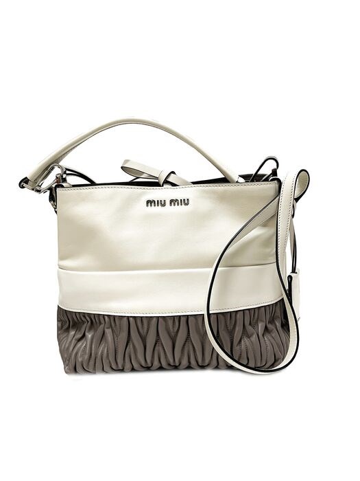 Miu Miu prachtige kalfslederen tas met kleikleurig reliëf aan de onderkant, wit en talkglad leren bovenstuk, afneembaar hengsel, verstelbare schouderriem.