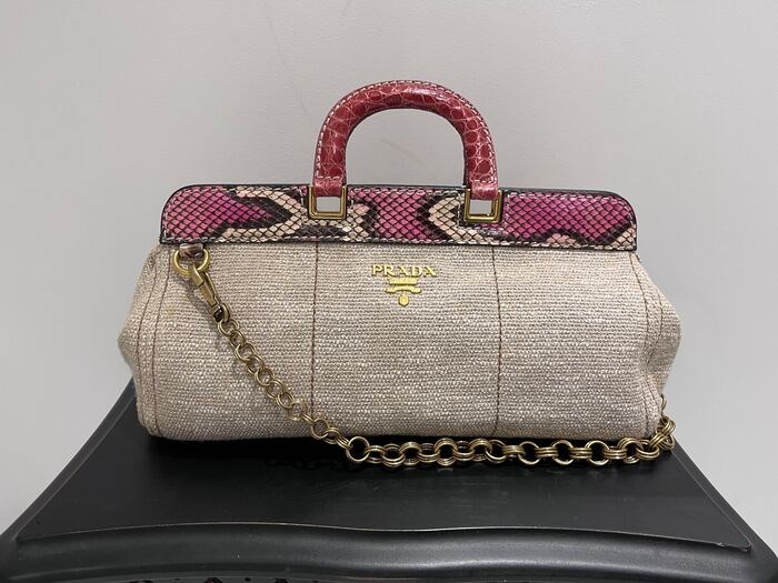 Tas in Bowling-stijl van Prada in beige stof en handgrepen van pythonleer, roze lederen binnenkant, met zijn binnenzakken, een gouden ketting die de stijl van de tas bepaalt, hij is in perfecte staat, slechts 3 keer gebruikt. Het wordt met de hand gedragen, het is erg praktisch en modieus, het wordt geleverd met de originele stofzak.