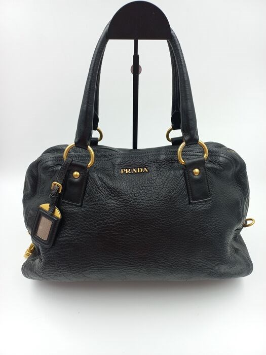 Prada zwarte lederen handtas. Er zijn lichte gebruikssporen op de stelen en op het huidoppervlak. Aanwezig in de afbeelding. Je kunt hem gebruiken als minikoffer. Het kan je vergezellen op reizen.
