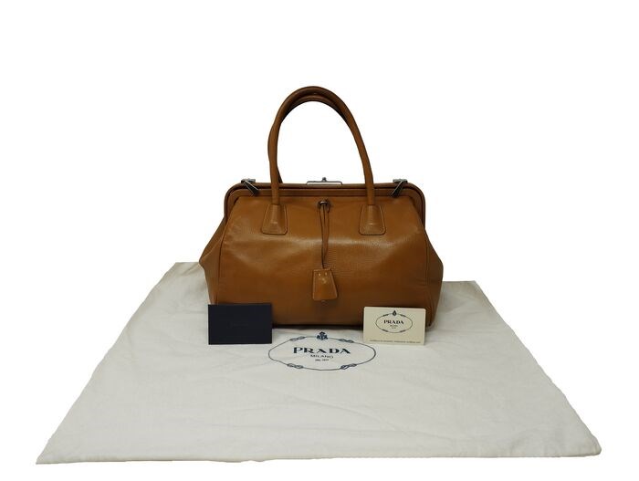 Schitterende leren handtas van lichtbruine kleur met wat lichte gebruikssporen. De tas heeft een vak aan de binnenkant met de authenticatiecode, hij wordt verkocht met dustbag, sleutels en authenticatiekaart. Het is een prachtig product gemaakt in Italië.