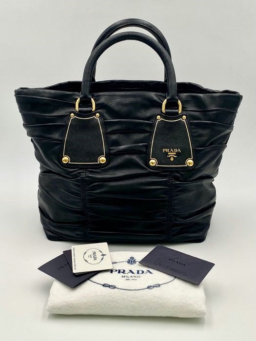 Prada shopping nappa reliëf zwart BN1244. Tas in spectaculaire staat, misschien een paar keer gebruikt. Compleet met stofzak en labels. Uitstekende staat, met slechts zeer lichte vlekken op een paar hoeken (zie foto's). Zwarte kleur. Gouden hardware. Tassel materiaal. Afmetingen tas: 27 cm (bodembreedte) x 28,5 (hoogte) x 15 (diepte). Verpakking: stofzak, authenticiteitskaart.