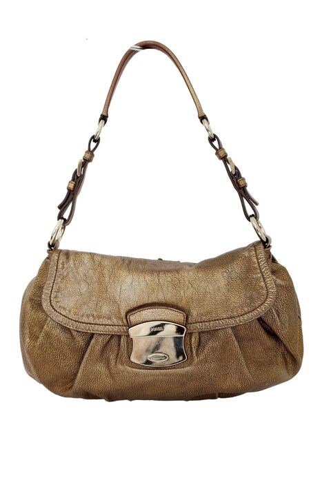 Prada schoudertas jaren 2000. Tas van bronskleurig leer met zilverkleurige details. Hij kan zowel in de hand als op de schouder gedragen worden. Clip knoopsluiting. Intern gevoerd met leer met ritsvak.