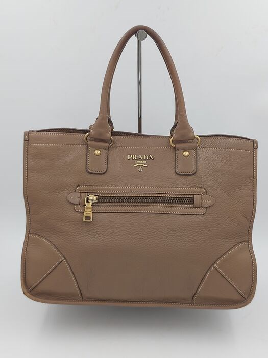 Prada bruine leren handtas. Het is een klassiek product. Het heeft een zachte toon, erg stijlvol. Het heeft 2 zakken aan de voor- en achterkant. Gebruikt, op de hoeken zitten gebruikssporen