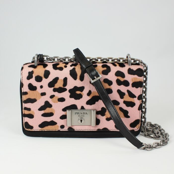 Deze Prada roze luipaardprint schoudertas met ponyhaar en nylon ketting 1BD009 heeft een stevige zilverkleurige schouderriem met ketting en een druksluiting. Draag dit met een kleurrijk ensemble of blijf bij de all black and white trend voor een frisse en moderne look!