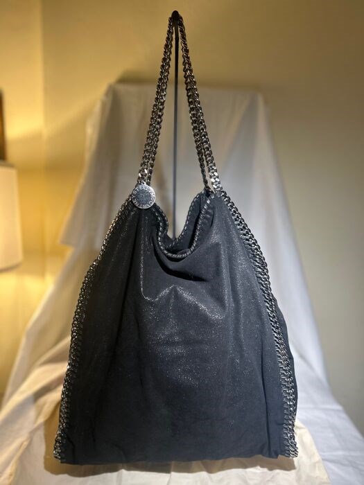 Zwarte Falabella Big Tote van Stella McCartney, het grootste model in de Falabella-serie, met twee kettingen, het heeft zijn eigen kleine portemonnee aan de binnenkant bevestigd met een karabijnhaak en ketting typisch voor het model, het heeft ook een klein zakje in veganistisch leer voor een zakdoek, in goede algemene staat, lichte gebruikssporen op de binnenvoering, handvatkettingen op sommige plaatsen licht geoxideerd, hardware licht geoxideerd, uiterlijk geen gebreken.