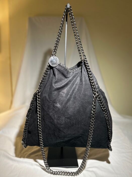 Falabella Fold Over Shaggy Deer van Stella McCartney in zwart vegan leer, met drie kettingen, iconisch model van het super gewilde merk, een echte must have voor elk fashion slachtoffer, het kenmerk van deze tas is dat hij in de hand gedragen kan worden, op de schouder of op zichzelf gevouwen.