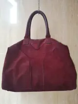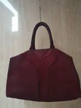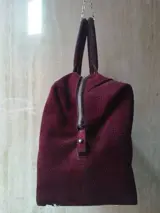 Tas met twee hengsels in bordeauxrood suède, met ritssluiting. Interieur bekleed met bruine stof met twee zakken.