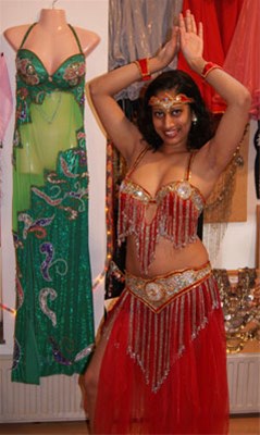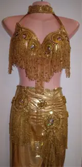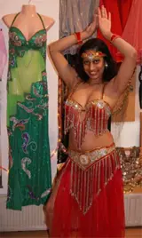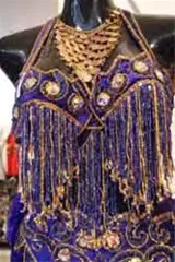 Schitterende rijk versierde buikdanskostuums en buikdanskleding, buikdans juwelen, buikdansgordels, muntenkettingen, buikdans bh's, gouden en zilveren schoentjes, Isiswings etc.