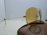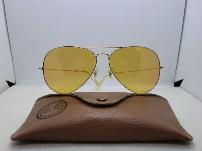 Vintage Ray-Ban Ambermatic pilotenzonnebrillen zijn een icoon van modern zonnebrillendesign, met de beroemde Bausch & Lomb Ambermatic fotochromatische lenzen en al meer dan 40 jaar de keuze van piloten, vliegeniers, matrozen en jagers. Ray-Ban Ambermatic-lenzen bieden een groter contrast tussen wolken en lucht en maakten het gemakkelijker om objecten te zien terwijl ze tegelijkertijd het licht geleidelijk blokkeren en 100% UV-bescherming bieden. Ray-Ban Ambermatic-zonnebrillen worden "slimme zonnebrillen" genoemd, gezien de manier waarop ze zich aanpassen aan de heersende lichtomstandigheden op dat moment. Op bewolkte en regenachtige dagen hebben Ray-Ban Ambermatic-zonnebrillen een licht amberkleurige tint om waas te doorbreken en het zicht te verscherpen. Op warme en zonnige dagen worden ze steeds bruiner om de schittering te blokkeren. Op koude en zonnige dagen veranderen de Ray-Ban Ambermatic pilotenzonnebrillen en shooters in donkergrijs voor een betere bescherming tegen directe en gereflecteerde schittering. Op bewolkte dagen veranderen Ambermatic zonnebrillen naar een lichtere bruine tint. In navolging van het succes van de Ambermatic-zonnebrillen, introduceerde B&L Ray-Ban vervolgens de Changeables-lijn van fotochromatische zonnebrillen en shooters die zeer vergelijkbare eigenschappen boden, maar waarbij de dichtheidskleurverandering nog dramatischer was dan bij de Ambermatics. De unisex Ray-Ban 62 mm pilotenmontuur meet ongeveer 5,5" tempel tot tempel met Ambermatic-lenzen van ongeveer 2,375" x 2,0" op de breedste punten, daterend van vóór de introductie van het lasergeëtste Ray-Ban-logo op de lenzen. De bovenkant van de neusbrug is onder de indruk van B&L Ray-Ban VS terwijl de onderkant van de brug onder de indruk is B&L Ray-Ban 62 [] 14.