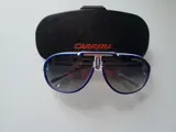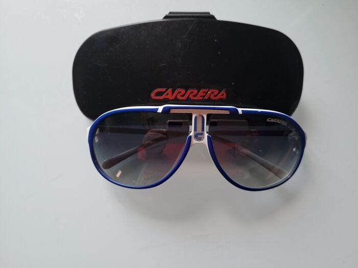 Deze witte Carrera bril met blauwe strepen is in uitstekende staat.De bril wordt geleverd met etui zoals u op de foto's kunt zien. Verzending zal per koerier zijn