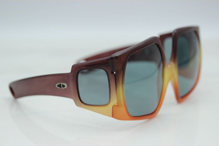 Tinten van bruin frame. Kleurverloop kunststof lenzen. Gesigneerd CHRISTIAN DIOR. OPTYL-logosticker. Indicatieve afmetingen : breedte ca. 14,5 cm (5,71 inch) / breedte tussen lenzen ca. 1,5 cm (0,59 inch) / lensbreedte ca. 5,6 cm (2,20 inch) / lenshoogte ca. 5,6 cm (2,20 inch) / lengte ca. 12,8 cm (5,04 inch).