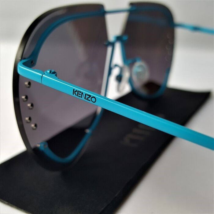 Metalen exoskelet montuur, dat aan de buitenkant van de zonnebril zit. Comfortabel iconisch Kenzo neuskussentje.
