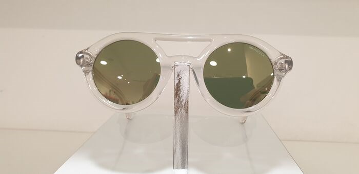 Essentie en goede smaak onderscheiden dit model van de Moncler ML0014 zonnebril in transparante kleur.De vorm van het volledige cirkelframe met dubbele brug en de felgroene gespiegelde lens geven stijl.Het symbool van het Maison wordt herinnerd op de slapen met het logo in reliëf