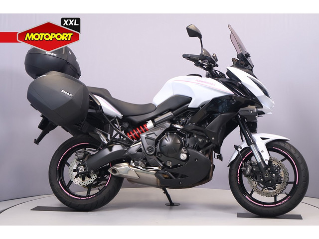 Deze Kawasaki Versys 650 is super compleet en voor de dames (of heren die van roze houden) leuk uitgevoerd met roze accenten.