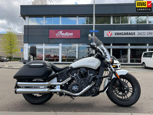 De INDIAN SCOUT is voorzien van mooie en functionele accessoires om er lekker op uit te gaan . Grote lederen tassen met binnen tassen zijn gemonteerd om genoeg spullen mee te nemen . De motor is in de kleur metallic wit en verder voorzien van een zwarte beschermbeugel met highway steps , afneembaar windscherm , vaste rugsteun voor de passagier en bagage rek.