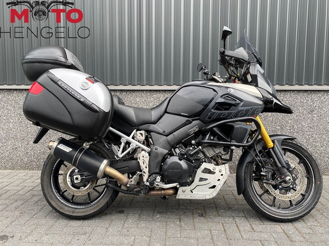 Suzuki V-Strom 1000 met 3-delige kofferset, Storm uitlaat voor het mooie tweecilinder geluid, valbeugels, comfortseat, middenbok, aluminium carterbeschermer, handvatverwarming, SW motech accessoires zoals schakelpook en beschermers en kettingsmeersysteem. Mooie volle tourmachine!