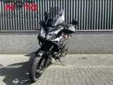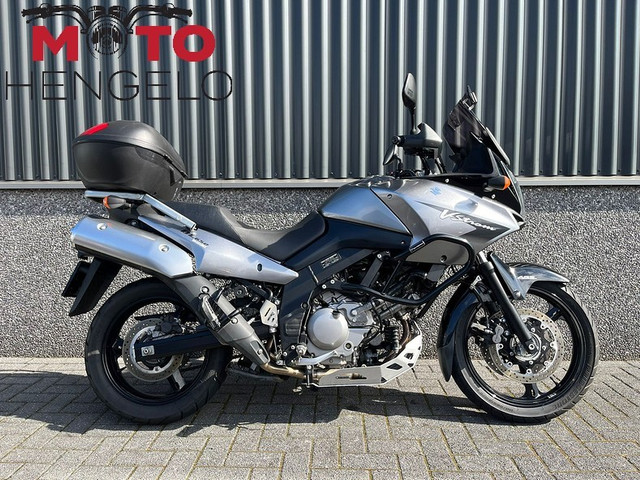 Nette V-Strom 650 ABS met topkoffer, getinte ruit met spoiler, valbeugels en Gipro versnellingsindicator.