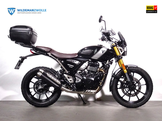 In nieuwstaat verkerende Scrambler 400X, nog in de fabrieksgarantie. Voorzien van topkoffer, valbeugels, handkappen, ruitje. In perfecte staat. Standaard op 30kW geleverd dus ook perfect voor de A2 rijder.