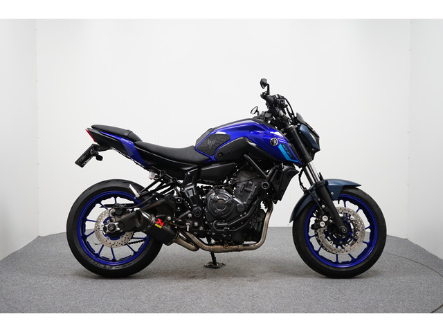 Een in nieuwstaat verkerende Yamaha MT-07 ABS 35 KW met Akrapovic uitlaatsysteem, Valdoppen, Comfort seat, Handvatverwarming, Quickshifter, Led verlichting, Led knipperlichten en korte kentekenplaathouder.