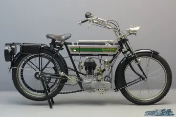 Already in the early 1900s the King Dick name and logo were adopted. It was that of the company owner’s show winning bulldog, and was seen as being symbolic of British tenacity and strength of character. Note the Bulldog head on the tank transfer! Abingdon machines were of sturdy design and they were very popular in the British colonies. A notable feature is the front fork suspension that acts with an enclosed central vertical spring and phosphor bronze guides in each fork leg. It’s constructed in such a way that there is no side play in the forks. Carburettor is Brown and Barlow, ignition is by a reliable Bosch instrument. Note the remarkable “spare belt and tyre tube receptacle annex rear number plate holder”, that is an original fixture on this model. The saddle is a Brooks B400 and accessories include a P&H acetylene lighting system, Lucas “No. 63 King of the Road” bulb horn, tank top mounted tyre inflator and a Philipson’s governor pulley. This device functions as a free engine system, actuated by a hand-operated lever with brake pad. When the brake pad is pressed to the brass spring box on the engine pulley its rotation is slowed and the pulley will open, thus crating a free running engine.
