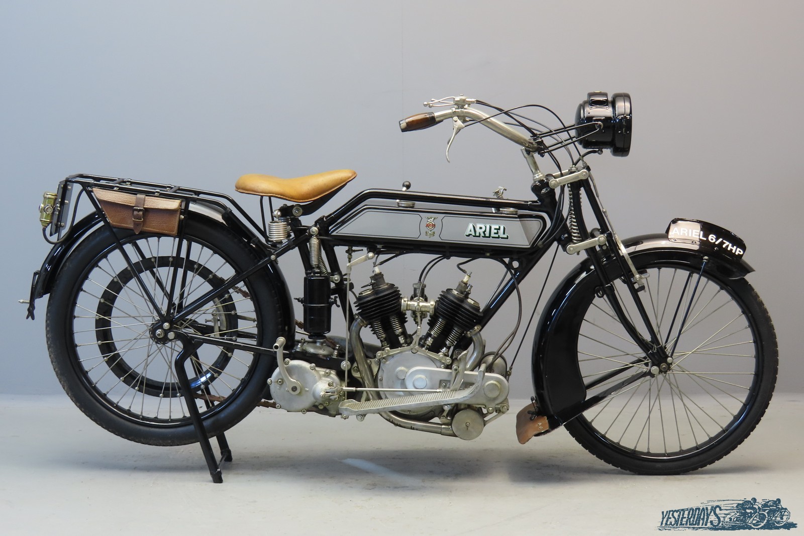 Components Ltd., the Ariel parent company, had been involved in producing motorized vehicles since 1898. For the 1910 season a radical change occurred in the motorcycle range. All previous models were discontinued and were replaced by 3 ½ HP machines that would remain in production for the next 15 years: the T-head White & Poppe engine, in which the inlet and exhaust valves were placed an extraordinarily 4 ½ inches apart. Because of this the new machines soon gained the nickname of “the Ariels with valves a-mile-apart”. The new models proved very popular with motorcycle enthusiasts and in 1911 Components Ltd. bought the patents rights of the engine and started producing the power unit itself, at the same time increasing the bore to enlarge the swept volume from 482 cc to 498 cc. For sidecar work a 2-speed, 7 HP V-twin powered machine was first catalogued in 1913. This engine had a capacity of 1000 cc and was manufactured inhouse. For 1914 this machine was replaced by a model that was powered by a 670 cc Abingdon engine and was fitted with a 3-speed countershaft gearbox with foot-operated clutch, chain-cum-belt transmission and a comfortable sprung saddle post. This new twin was also available in solo form. For the 1919 model year the 670 cc Abingdon engines were discontinued and replaced by 6-7 HP 795cc power units of the same manufacturer, with bore x stroke dimensions of 73 x 95 mm.